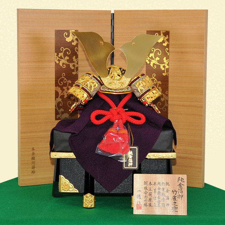 超コンパクトに本金箔で竹雀の兜を飾るなら屏風と兜だけでシンプルに飾ってもなかなか良いです。他の兜でも出来ますのでお気軽にご相談ください。